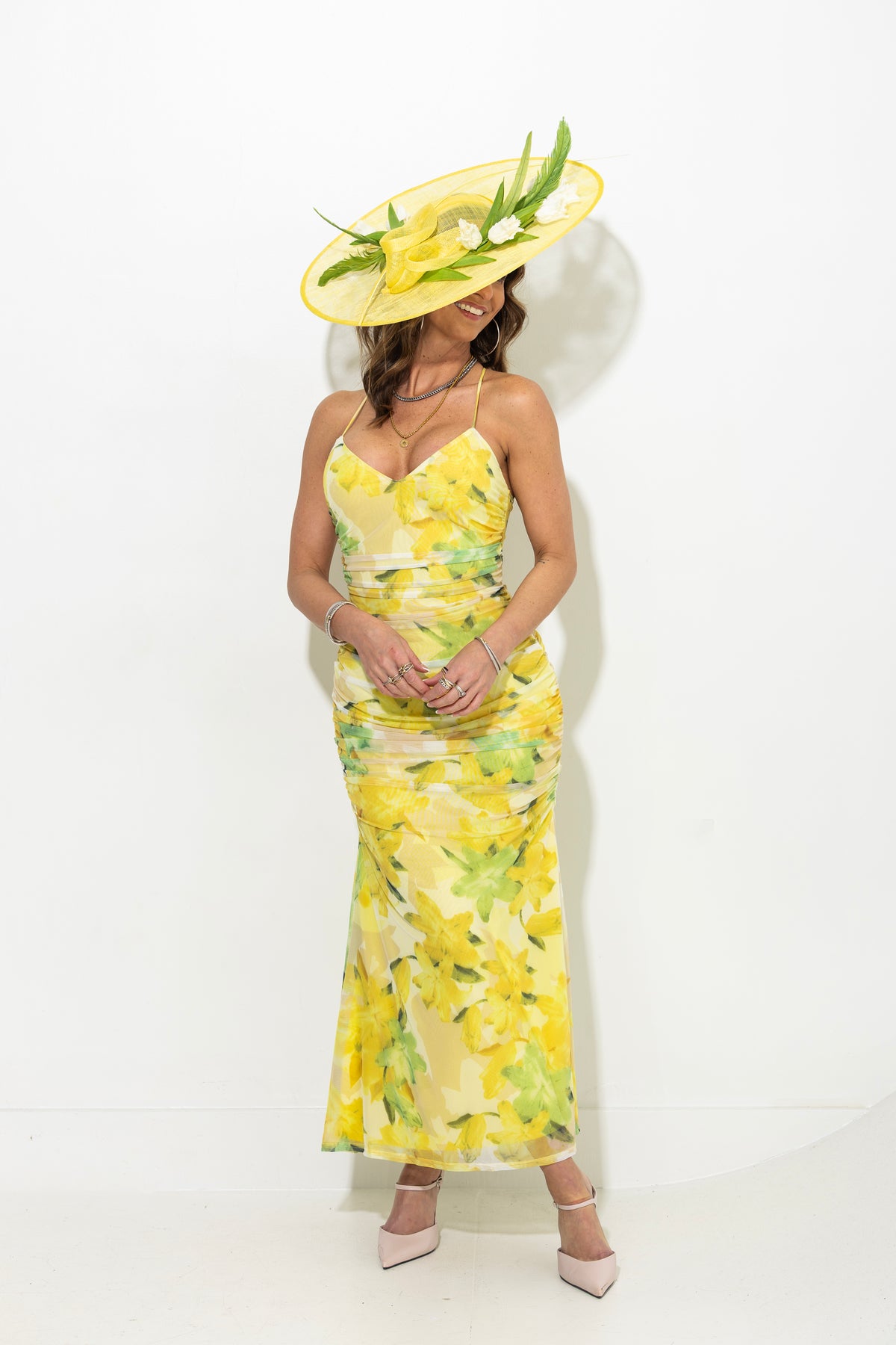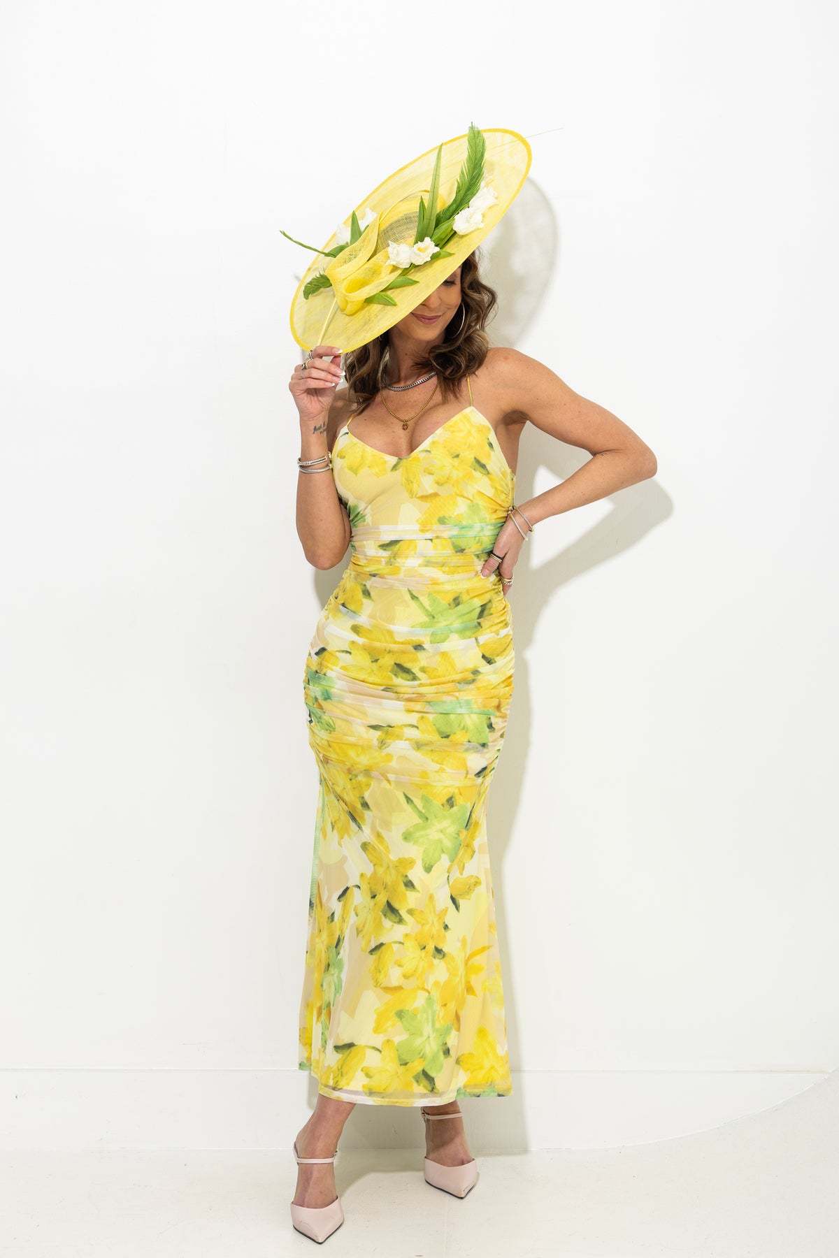Spring & Summer wedding season called, they approved this dress! Bright yellow with mix of greens and soft tones, this dress hugs all the right places. Ruched sides, lace up open back, with midi length mermaid hem. Fully lined. Size pictured, small.