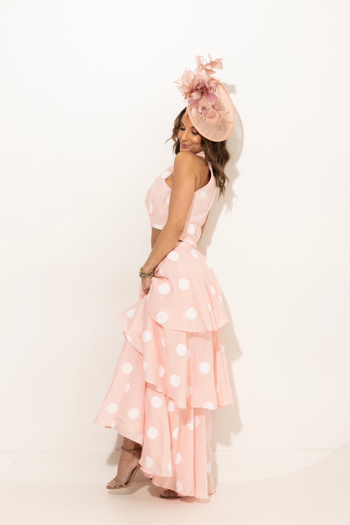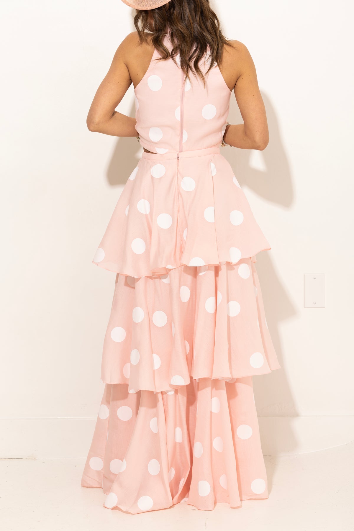 Sophisticated and charming, this soft pink polka dot set is perfection! Tiered ruffle maxi skirt with slightly cropped halter top with hidden back zipper. Size pictured, small.